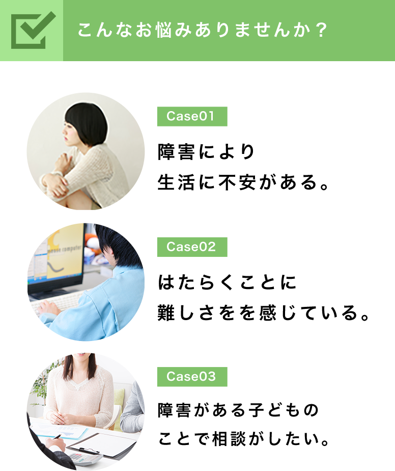 ※具体的なお悩み例:環境整備、作業種の選定、就職後の定着について、職場内のトラブルなど