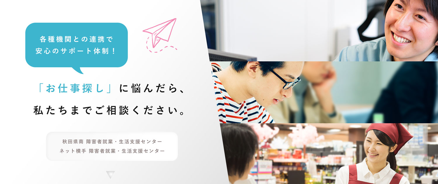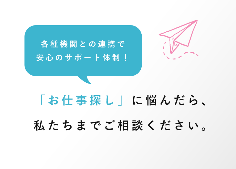 就労のご相談、就職先の開拓、基礎訓練、就職後のアフターケア、雇用に関する情報提供を支援しています。「就職したいけど、どうしたらいいか分からない」と言うお悩みや「離職をしてしまったが、再就職をしたい」、「失業給付の手続きが分からない」というお悩みなど、就労への不安点や不明点を一緒に考え、解決を目指します。